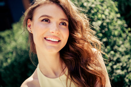 Beautiful young woman smiling outdoors on a bright sunny day surrounded by lush greenery, enjoying leisure moments.