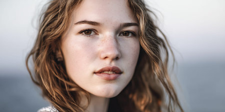 This stunning close-up portrait features a young woman with natural makeup, soft curls, and a warm expression. The beauty of her skin and freckles shines against a neutral backdrop.