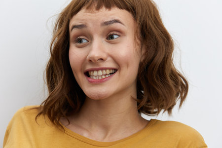 a happy, joyful, smiling woman emotionally looks away, standing on a white background in a yellow T-shirt.