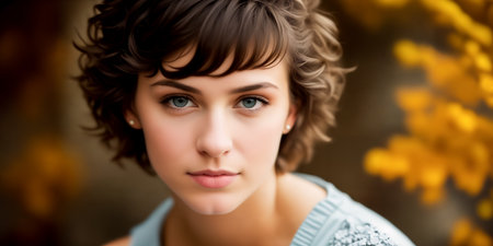 Young beautiful brunette girl with short dark curly or wavy brown hair with a confident gaze, outdoor close-up and blurred autumn background with orange tree leaves. Generative AI