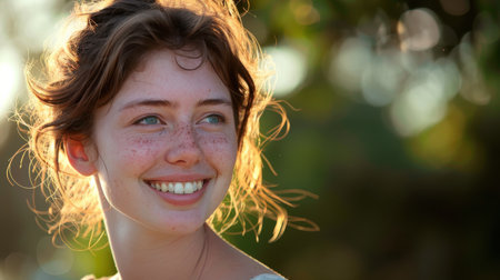 Authentic portrait of a happy young woman with natural freckles and a radiant smile, captured outdoors during golden hour. Perfect for conveying joy, wellness, and natural beauty in commercial projects.