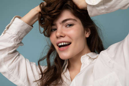 Portrait of beautiful positive cheerful cute smiling young brunette woman in casual white shirt isolated on blue background with copy space