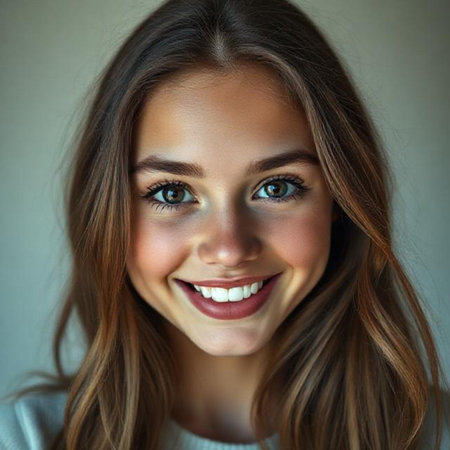 A cheerful young woman showcases her beautiful smile and stylish hair in this engaging portrait. The neutral backdrop enhances her warm expression. Perfect for lifestyle themes.