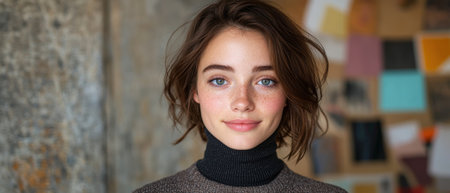 A young woman with curly hair gazes confidently at the camera. Soft natural light highlights her features creating a warm and inviting atmosphere in a cozy indoor space.