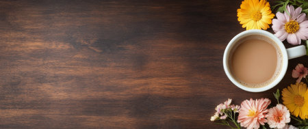 A warm cup of coffee sits beside a bouquet of fresh pink and white flowers on a rustic wooden table, creating a tranquil atmosphere perfect for morning relaxation.