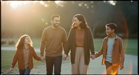 Happy family walking in the park. Mother, father and children having fun outdoors.