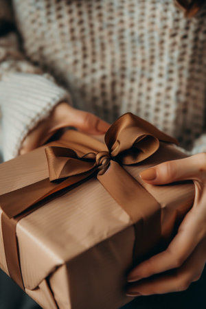 Close up on female hands opening the gift, untying the ribbon. High quality photo