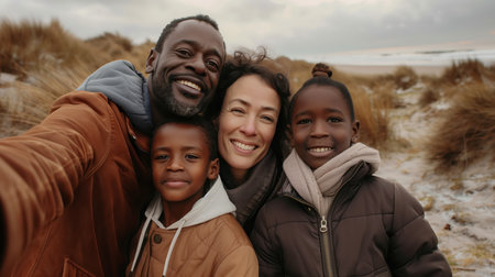 Happy family bundled up in warm clothes is taking a selfie on a cold and cloudy winter day at the beach