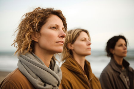Portrait of three young women looking away while standing on beach in autumn