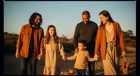 A joyful family of five, including parents and three children, holding hands and walking on a beach at sunset.