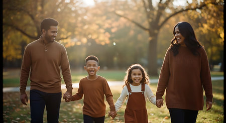 A family of four, dressed in warm brown and orange clothing, walking hand in hand in a sunny autumn park.