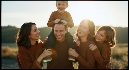 A joyful family of five, including two adults and three children, posing outdoors during sunset with warm smiles and embracing each other.