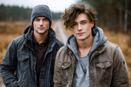 Young men standing in nature, embracing friendship and togetherness during the cooler season