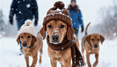 A close up of three cute brown dogs walking in the snow. The main dog wears a funny pom pom hat and scarf. People are blurred in the background during a snowfall.