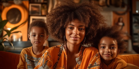 Generative AI : Joyful african american family mother and little boy son in Halloween costumes making scary gesture and looking at camera while sitting on sofa in decorated living