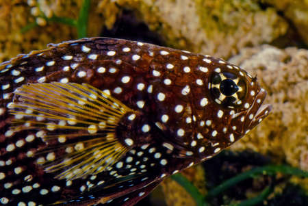 Capture the beauty of a vibrant spotted fish swimming in clear water, highlighting its striking patterns and unique features, ideal for nature and marine themes.