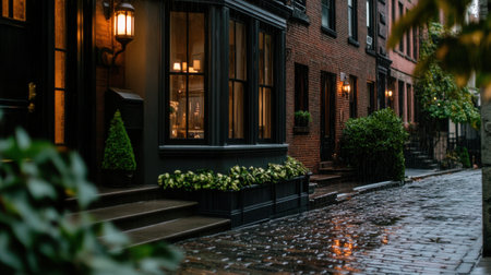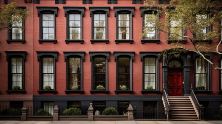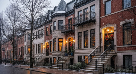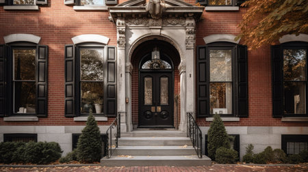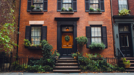 A stunning urban brownstone features rich brick texture, elegant windows, and a tasteful wreath on the door, surrounded by thriving greenery. This image captures the charm of a historic neighborhood, perfect for showcasing urban living and design.