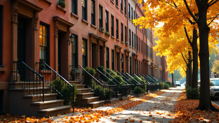 Golden leaves blanket the sidewalk as sunlight filters through the trees, illuminating the red-brick townhouses in a tranquil neighborhood during autumn.