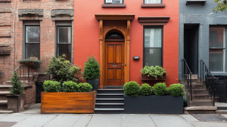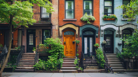 Explore a serene urban scene featuring charming row houses with vibrant colors and lush greenery. The inviting entrance and floral accents create a cozy atmosphere.