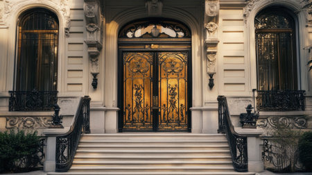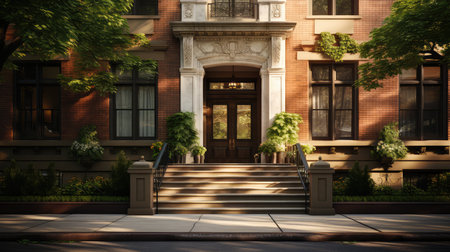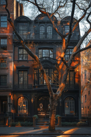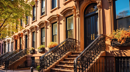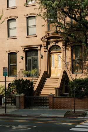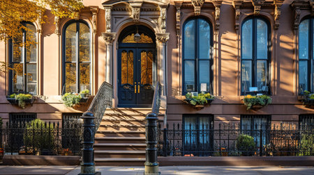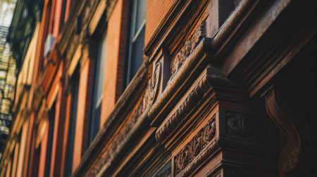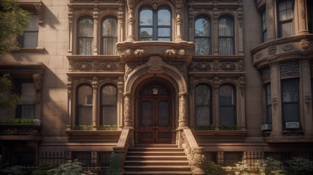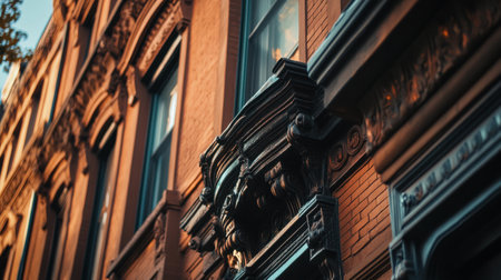 The warm afternoon light highlights the elaborate carvings and textured brickwork of a historic brownstone, reflecting the charm of urban architecture.