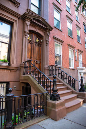 New York City townhouse building, Brooklyn Heights residential district, USA. Brownstone urban architecture, attached house. United States real estate, american property, apartments and homes in NYC.