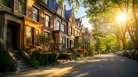 Sunlight bathes a picturesque tree-lined street showcasing historic homes. The serene atmosphere invites exploration of the lush greenery and elegant architecture.