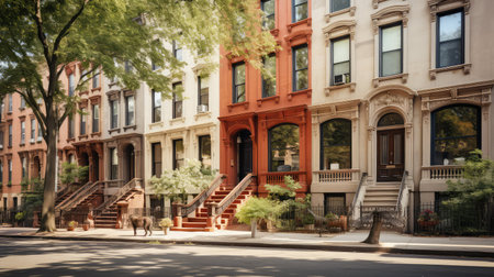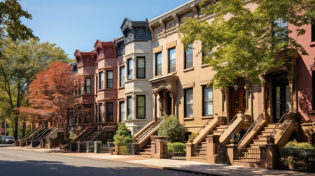 Generative AI Row of Beautiful Old Brownstone Homes with Staircases along an Empty Sidewalk and Stre