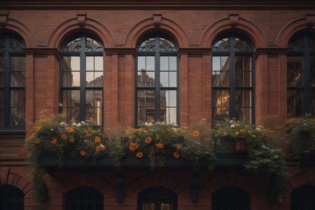 A historic row house with a red brick facade, ornate ironwork, and flower boxes on each window.