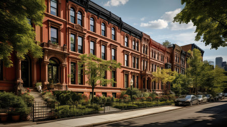 BROOKLYN, NEW YORK - MAY 11, 2017: New York City brownstones at historic Prospect Heights neighborhood. Prospect Heights is an affluent residential neighborhood within the New York borough of Brooklyn