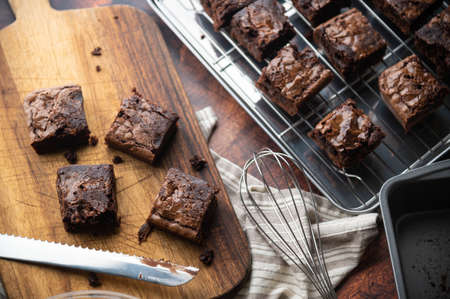 Best brownies dessert in a cake pan. High angle view of freshly baked brownies. Delicious chocolate cake.