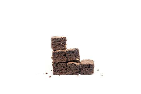 A closeup of delicious fudge brownies stacked on each other on a cut board isolated on a white background