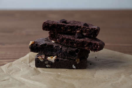 Close-up of homemade chocolate brownies squares with walnut pieces, chocolate strands and granola. Natural, healthy food concept.