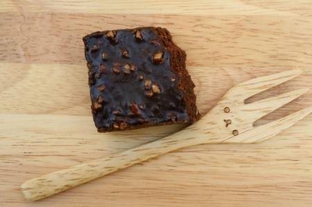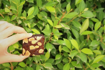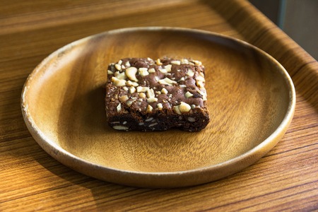 Chocolate brownie topped with almonds and cashew nuts. Bakery to eat with coffee.
