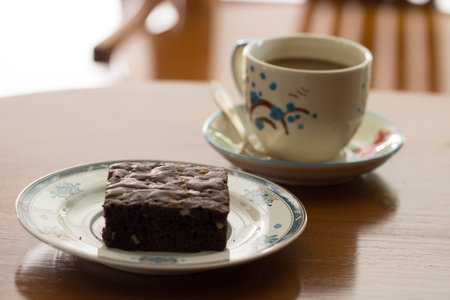 Freshly brewed cup of coffee with cake on cafe table - rustic coffee shop setting