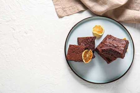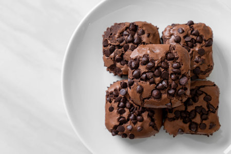 A cubes of chocolate brownies on a white plate on a marble table. Close-upshot.