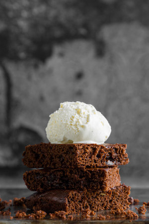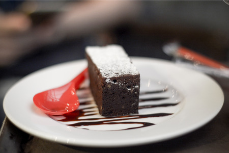 Brownie cake with Chocolate Sauce. Homemade Chocolate Dessert. A popular dark chocolate cake. Close-up.