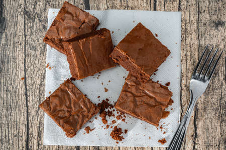 Close up of a Chocolate brownies on a rustic wooden table with chocolate chips and chocolate soil next to the brownie portions.