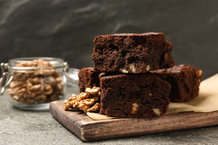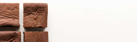Chocolate brownie squares with walnuts on cutting board, top view, horizontal composition. Flat lay food
