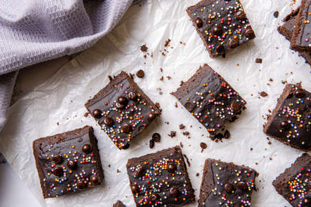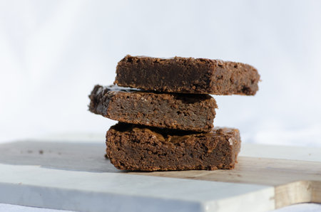 Vegan brownie squares on a white table, close-up. Plant-based dessert concept.