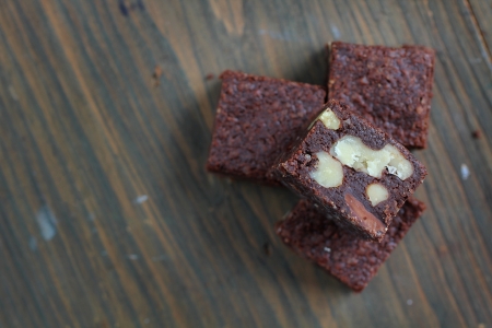 Variety of Brownies include Almond Macadamia Peanut and Chocolate Chip on the white dish and wood table from above view