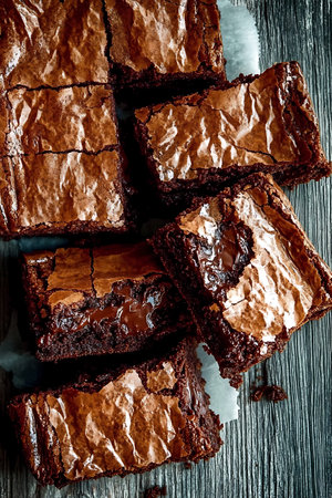 Mouthwatering freshly baked chocolate brownies with a cracked surface, placed on a rustic wooden background. Perfect for dessert lovers and snack enthusiasts.
