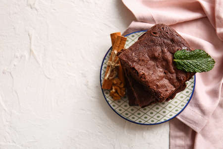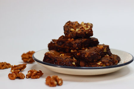Homemade chocolate brownie squares with pecan pieces served on a white plate. Natural, healthy food concept. High view.