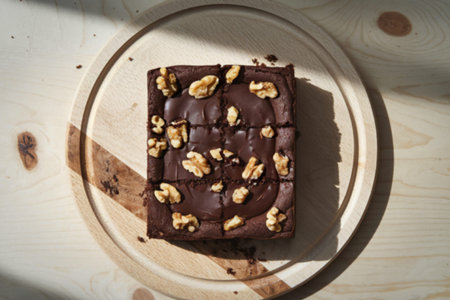 Rich, fudgy walnut chocolate brownie topped with crunchy walnut pieces, set on a bakery backdrop. A decadent American dessert perfect for indulgent food photography, Baking blogs and treat visuals