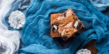 Cream cheese brownies with cookies on blue. Winter christmas treat square chocolate bars.