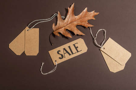 Black Friday Sale. Paper tags, autumn leaves, shopping concept with discounts. Dark brown background, trendy hard light, dark shadow, close up
