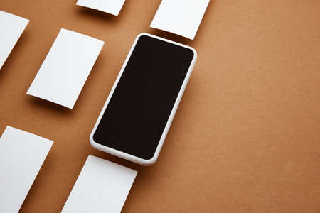 Device with blank screen floating above brown background. Phone and cards. Office styled, modern mockup for advertising, image or text. Blank white copyspace for design, business and finance concept.