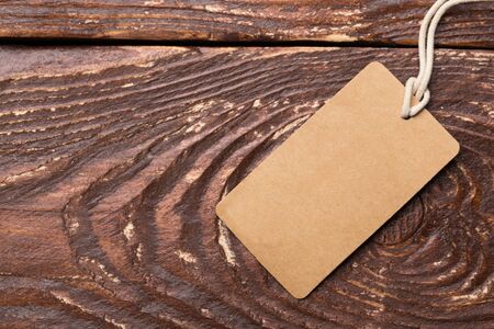 Three white and gray cardboard rectangular blank tags for clothes positioned in center of brown background with white one put vertically and gray ones horizontally. Tag mock up. Copy space