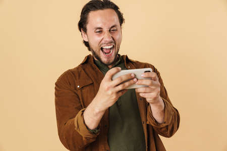 Image of excited young man playing on cellphone and screaming isolated over beige background