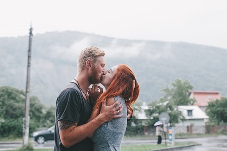 Cheerful loving each other couple kisses. Walk in the park and hug.