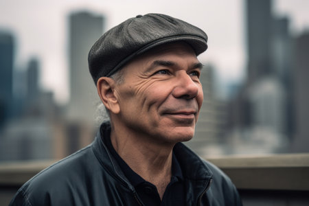 Portrait of a handsome mature man in a black jacket and cap outdoors